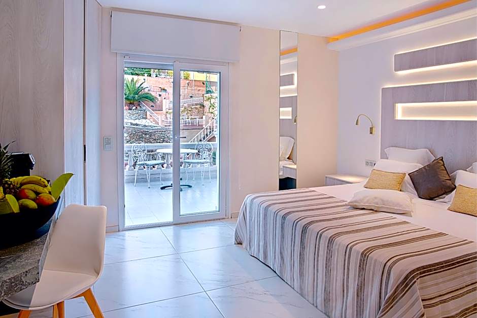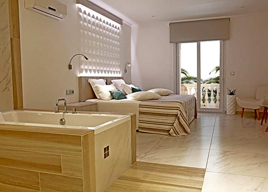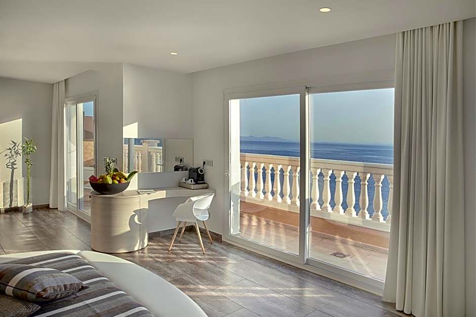 Located on the top floor of the hotel, these spacious suites include a large terrace with incredible views of the Mediterranean Sea and the Bay of Roses. They feature modern, luxurious décor and a separate living area. The terraces come with a chill-out bed, chairs, tables and a shower.